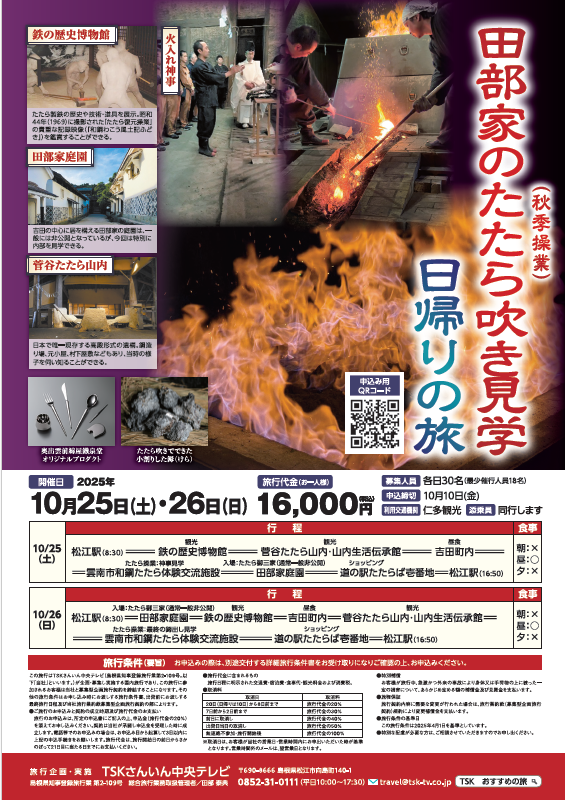 10/25(土)26日(日)、田部家のたたら吹き(秋季操業)を日帰りで見学できるイベントを開催します。